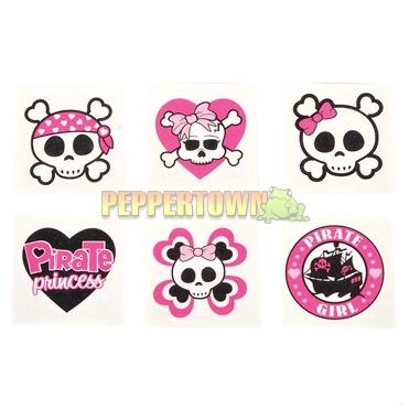 A great giveaway for princess theme parties and birthday celebrations. This colorful collection of temporary tattoos features a variety of girly pirate designs. Each unit has instructions on adhesive backs. Size: 1.5in.