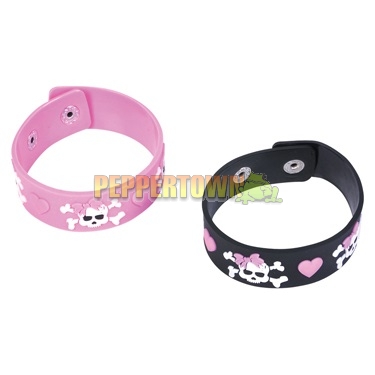 A great prize for lady raiders at pirate theme parties. These rubbery bracelets feature a cute array of girly pirate designs. Adjustable metal snap enclosure.