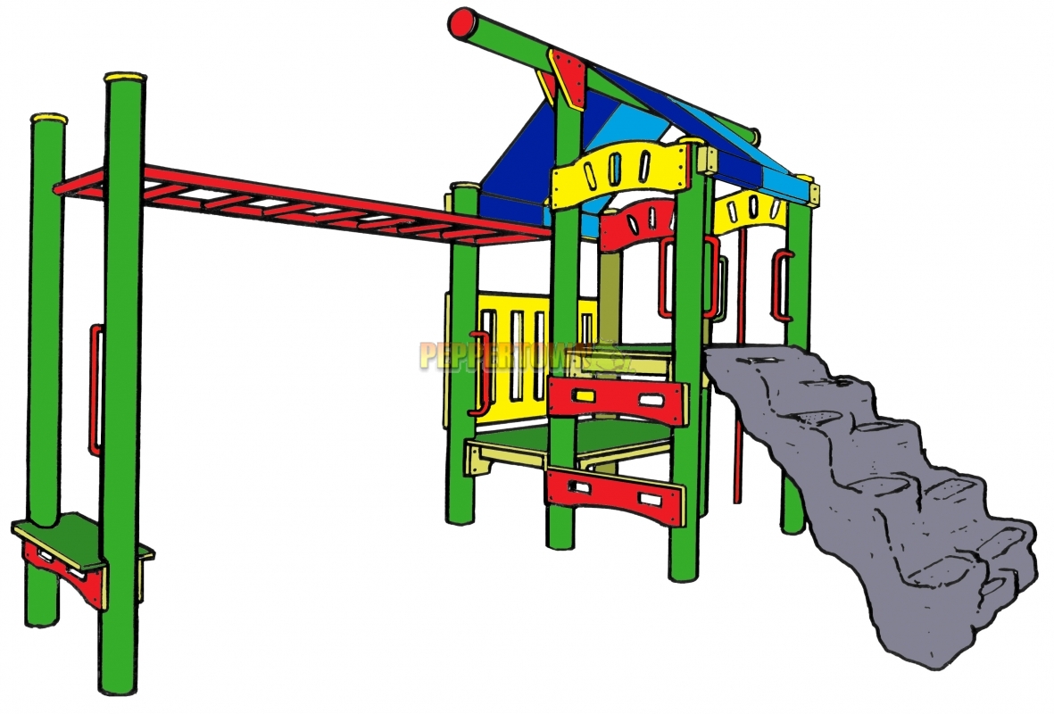 Designed to encourage climbing skills. The Hunter features a monkey bar which can be set at a height to suit both Junior and Senior Primary use. The Moulded Fibreglass Climbing Wall and Slide Pole offer alternative entry and exit routes to the Monkey Bar. Constructed from 125mm Envirolog treated pine logs, Enviropanels, high grade galvanised fasteners and waterproof canopies. These playgrounds have been designed for use on grass, outdoor carpet and other soft surfaces.