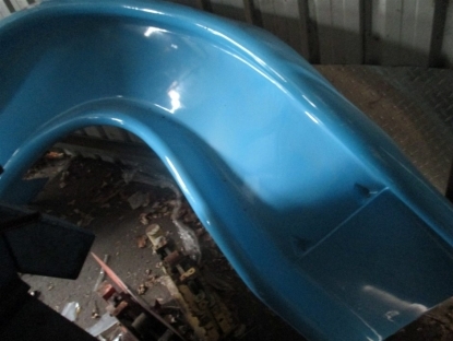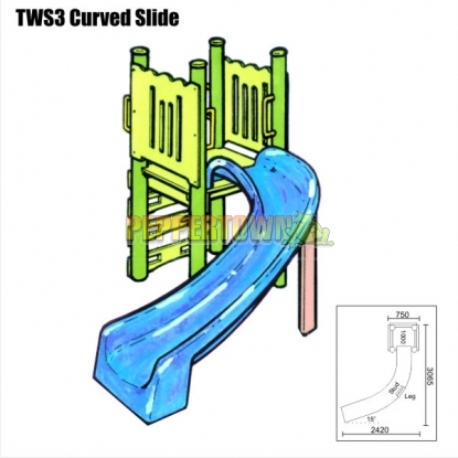 TWS3 Curved Water Slide Kit. Includes water jets, stand, safety handles and deck. Heavy Duty Fibreglass Pool Water Slide designed to curve around to the right from a deck height of 1200mm. The outside edge of slide is supported by a timber leg which must be concreted into the ground. Two recessed water jets are fed “T” section plastic hoses from either the pool filter return or water mains tap(standard hose fittings will connect to the water jets). Please leave a message when checking out as to whether a right or left hand direction is required.
