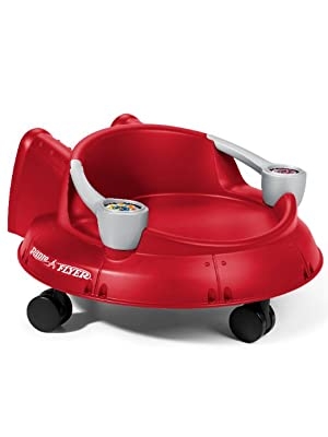 Get your child ready for some out-of-this-world fun with this Radio Flyer Spin 'N' Saucer. This toy is equipped with 360-degree movement wheels that allow children to create their own motions which will delight them for hours on end. They can move in any direction, and there is no getting stuck so the fun never stops. The unique design offers a low-profile seat for stability, and the ergonomic handle gives kids the leverage needed to spin freely. Illustrated hand rests let children dial into the unknown, all from the security of the Radio Flyer Spin Saucer seat. Optimized for comfort, safety and hours of fun, this toy is good for creative kids with an appetite for adventure. Featuring the bright red color that is synonymous with Radio Flyer toys, it is designed for maximum visibility and safety around the home. Kids of all ages under 49 pounds will be delighted with the spinning action.