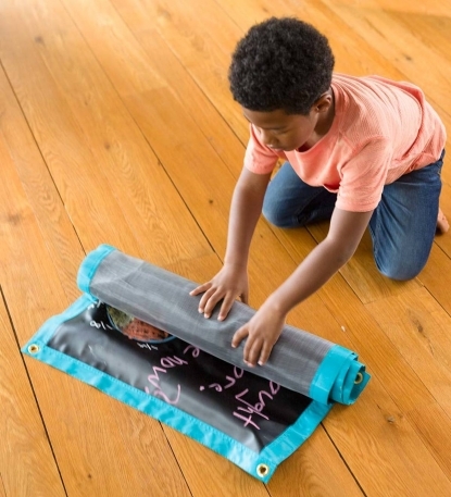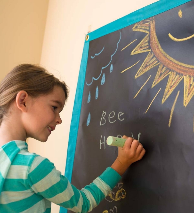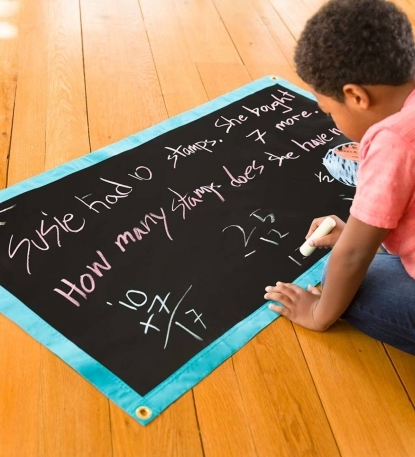 Introducing a welcome solution for “indoor” days! Our portable, roll-up chalk mat wipes down easily with a damp cloth, and is edged in blue poly/canvas. Hang the mat in either direction using grommets installed at each corner, or simply roll it out on floor or table and get to work with the five colourful jumbo chalks included. A perfect tool for imaginative self-expression in playrooms and classrooms alike, the mat stores in a reusable tube when your young artists are at rest.