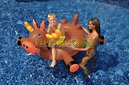 Who let the animals in the pool? Get crazy with this jumbo wacky 54" animal inspired ride-on float. This Laugh Out Loud inflatable float will put a smile on your face. Kids will have a blast riding the waves on the back of a big colorful moose complete with horns and silly snout! Constructed of durable vinyl with 2 sturdy handles, this character ride-on is sure to keep you afloat all summer long. Large enough for 2 kids or 1 adult. Includes repair patch kit.