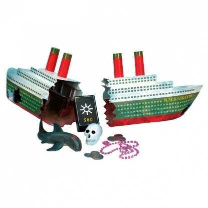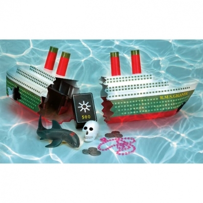 Dive deep for sunken treasure with this Swimline Shipwreck Dive Game. This set includes a full 45cm ocean liner float that breaks apart to disperse coins, jewels, skulls and sharks.