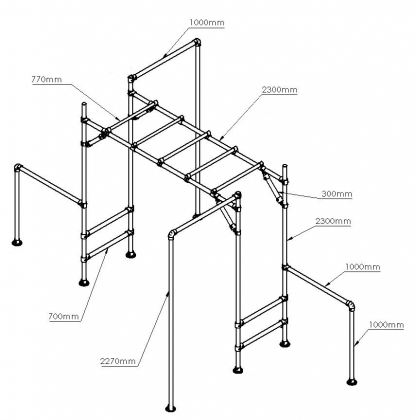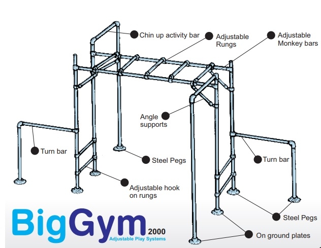 The Big Gym 2000 is a on ground Monkey Bar and Pull Up Bar Combo kit. Perfect for DIY enthusiasts, the adjustable modular design lets you move each tube and fitting around, allowing you the variation and freedom to change up the layout keeping your playground new and challenging. Set it up as part of a backyard Ninja course.