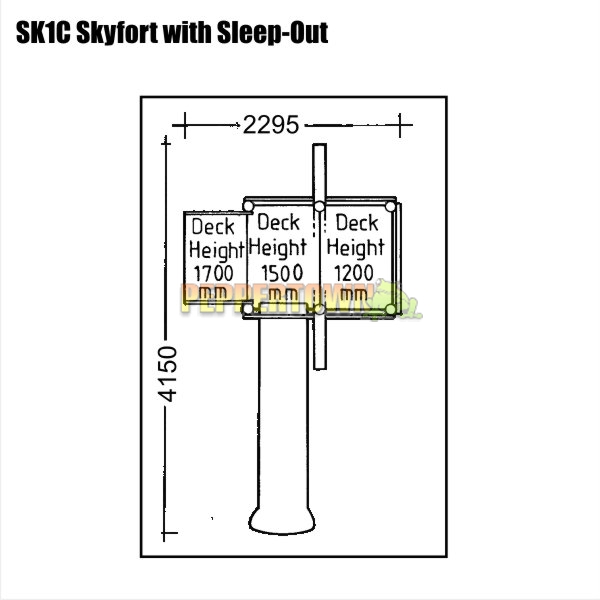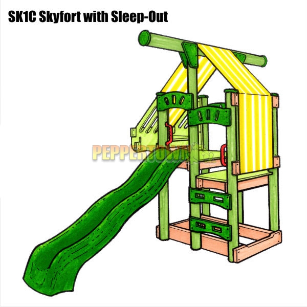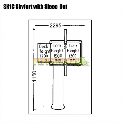The Skyfort with Sleep-Out has two adjustable decks as well as a "Sleep Out" Kit that can be installed on the left or right side of the fort. The playground kit also includes a Turbo Super Scoop Slide (suits deck 1.5m high), one pair of AX10 Moulded Safety Handles and a Single Layer Sandpit (includes Ground Sheet). Many customers add a sandpit cover to their order to keep cats and possums out. To install this playground you will need 2 x 20kg bags of concrete, a powerful drill and a level to install this playground.